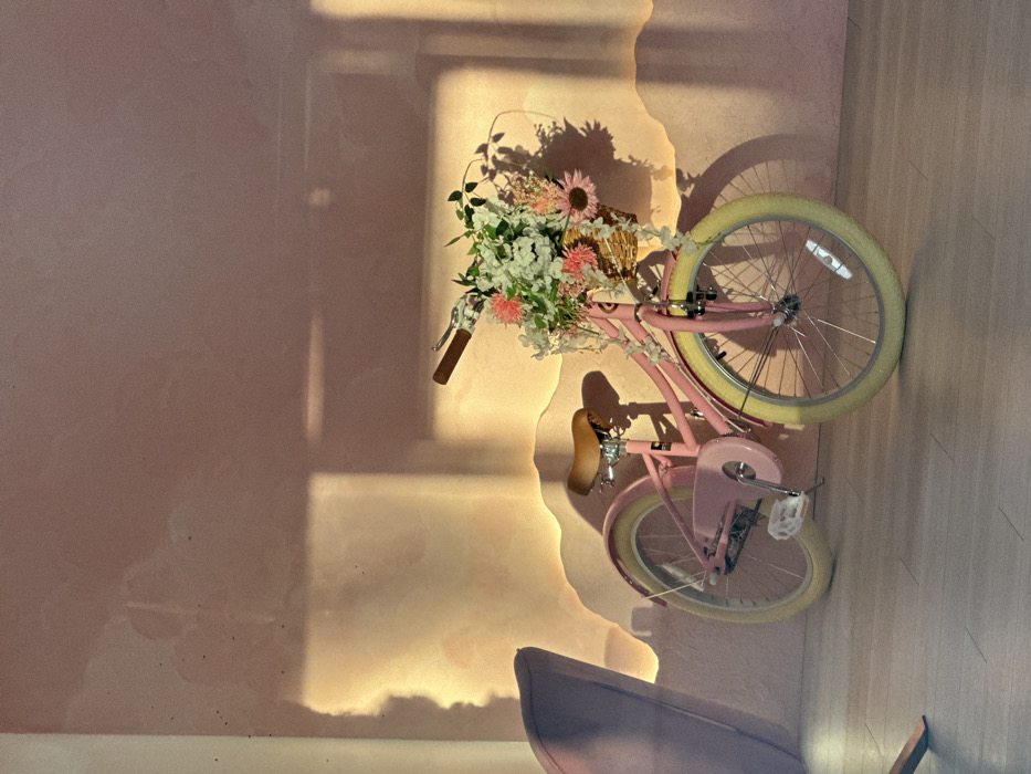 The scene is an interior view in Brentwood, United Kingdom. A pink bicycle with cream-colored tires, a brown seat, and brown handlebar grips is positioned facing the viewer, slightly angled to the left. A wicker basket containing an arrangement of artificial white, green, pink, and light purple flowers is attached to the handlebars. The bicycle rests on a light wood-grain floor. The background features a textured, pastel pink wall. The lower section of this wall has a raised, wavy, contoured relief feature, which is illuminated from behind or below, casting a warm, yellowish-orange glow onto the wall surface above it. Strong light sources cast distinct rectangular and linear shadows across the pink wall, originating primarily from the right side of the frame. A portion of a light pink upholstered chair or sofa is visible in the lower-left corner. No individuals are present.