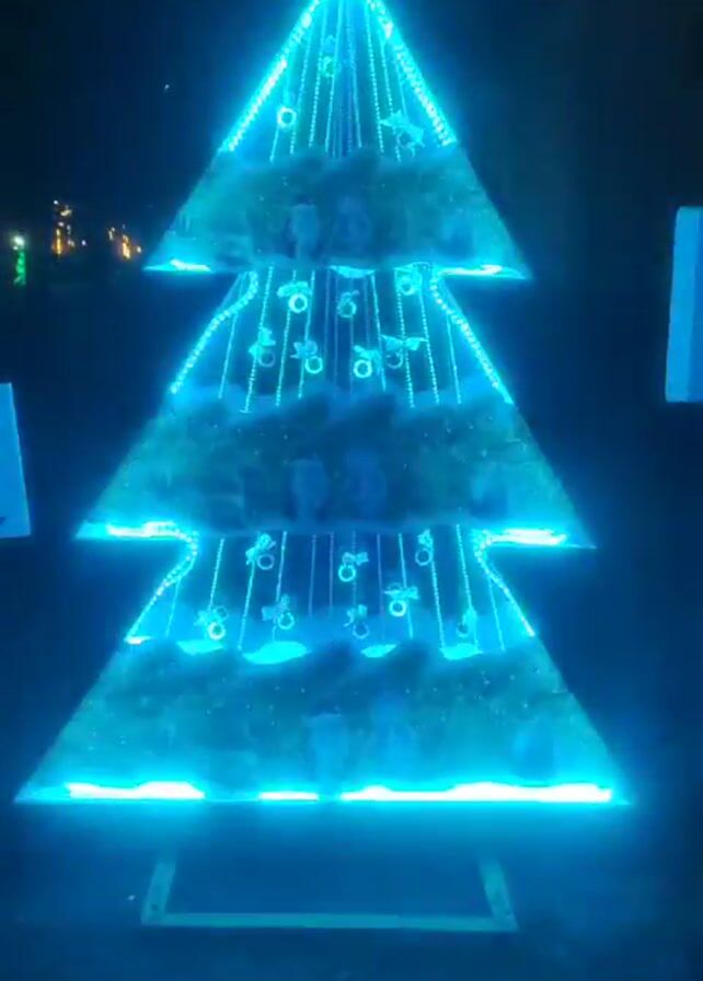 The video depicts an outdoor Christmas display featuring a tree-shaped structure illuminated by vibrant LED lights