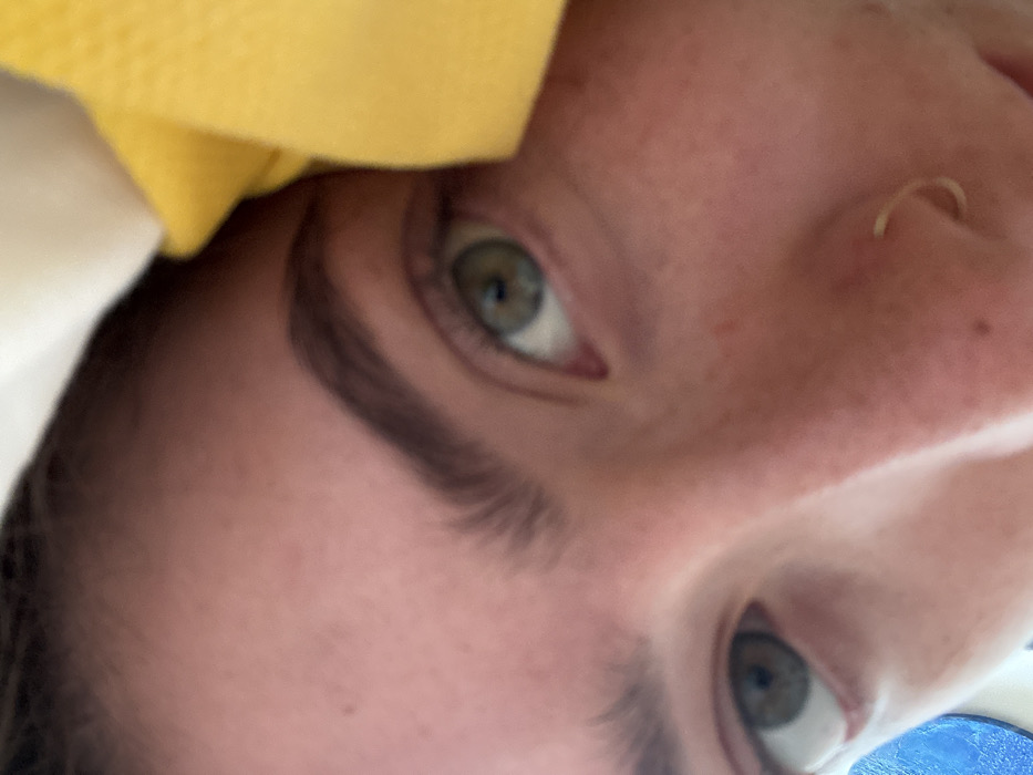 An extreme close-up, rotated view, centers on a person's face. Light green eyes dominate, framed by dark eyebrows. A gold hoop adorns the nose. Fair skin shows freckles and minor blemishes. A blur of yellow fabric is visible in the upper left corner, possibly a blanket or clothing. Dark hair appears along the left edge. The overall impression is one of intimacy and directness.