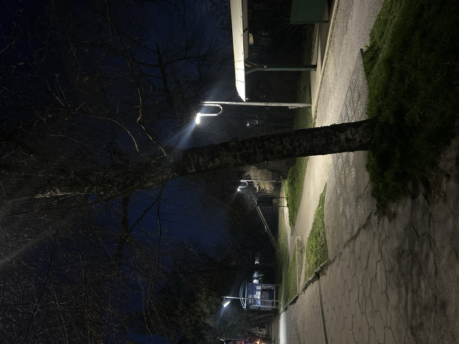 This nocturnal image depicts an outdoor public space within the city of Troyan, Bulgaria. The scene is illuminated by multiple artificial streetlights under a dark, blue-black sky. In the immediate foreground, slightly right of center, stands a large, bare deciduous tree with prominent bark texture, its branches extending into the upper frame. To the left, a patterned concrete paver sidewalk extends longitudinally into the background. Parallel to this sidewalk, separated by a narrow strip of green grass, lies a smoother, lighter-colored paved pedestrian path. On the right side of the image, positioned near the foreground tree, is a bus stop shelter featuring a light-colored, slightly sloped roof and a dark-colored back panel. Further down the path on the left, a second, glass-enclosed bus stop shelter with a light roof and visible internal display board is present. Between the two paved paths in the mid-ground, a dark, angled structure, possibly a ramp or slide, is discernible amidst sparse vegetation. Numerous modern, U-shaped LED streetlights provide bright white illumination throughout the area, casting distinct shadows. The ground shows areas of green grass interspersed with the paved surfaces. No individuals are present within the frame, and the environment appears deserted.