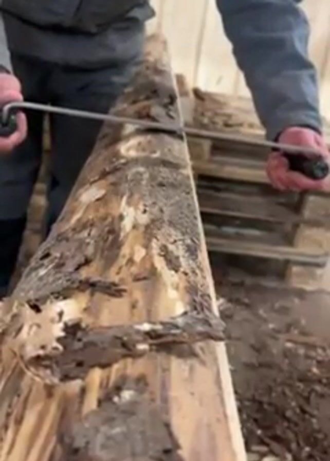person in a gray jacket and black pants using a hand tool with two handles to remove bark from a log. The log is lying horizontally and has a rough, dark, and textured surface. There are wood pallets in the background. The environment is indoors. The person is using a pulling motion with the tool to scrape off the outer layer of the log.