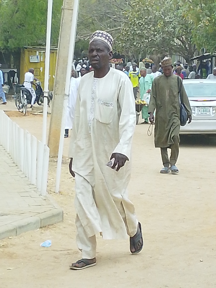 The image presents a daytime street scene in Hotoro South, Nigeria. The primary subject, a dark-skinned male of indeterminate age, walks towards the viewer's left on an unpaved, light brown dirt path. He wears a light-colored (possibly off-white or cream) traditional garment, consisting of a long-sleeved tunic with white embroidered patterns on the chest and a left breast pocket, matching trousers, and dark flip-flops. He wears a white cap with a dark, patterned design on his head and holds a small, light-colored object in his right hand. Behind him and slightly to the right, a second male subject walks in the same direction. He wears a dark olive-green traditional tunic and trousers, a dark cap, and light-colored sandals. A dark shoulder bag is slung over his left shoulder, and he holds a string of brown beads in his right hand. In the midground, a silver sedan with the Nigerian license plate "DMD 446AA" is visible on the right. Further into the background, a man pushes a cart laden with bananas, and a crowd of other individuals are present, some walking, others near a parked motorcycle on the left. The left side of the scene features a raised concrete curb alongside a series of white vertical posts or bollards. A yellow, container-like structure is visible in the background on the far left. Sparse trees and foliage define the upper background. The ground is consistently unpaved and light brown.