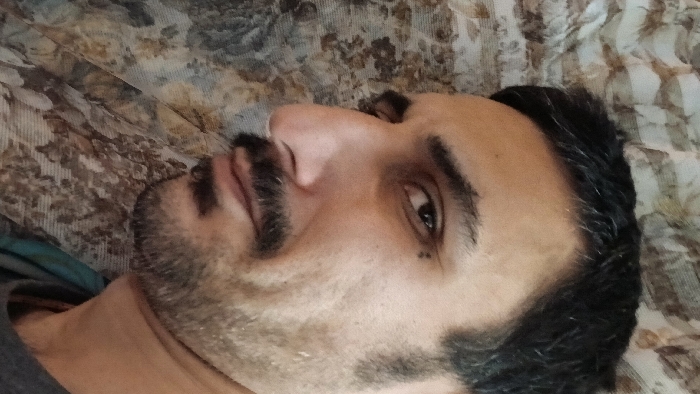 A man with dark hair and a mustache lies on a patterned surface. His head is turned towards the viewer, with his right eye visible and focused. He has stubble on his face and a mole near his eye. His skin tone is light brown. Part of his shoulder and neck are visible on the left side of the frame, suggesting he's wearing a grey t-shirt. The background is a blurred floral pattern.