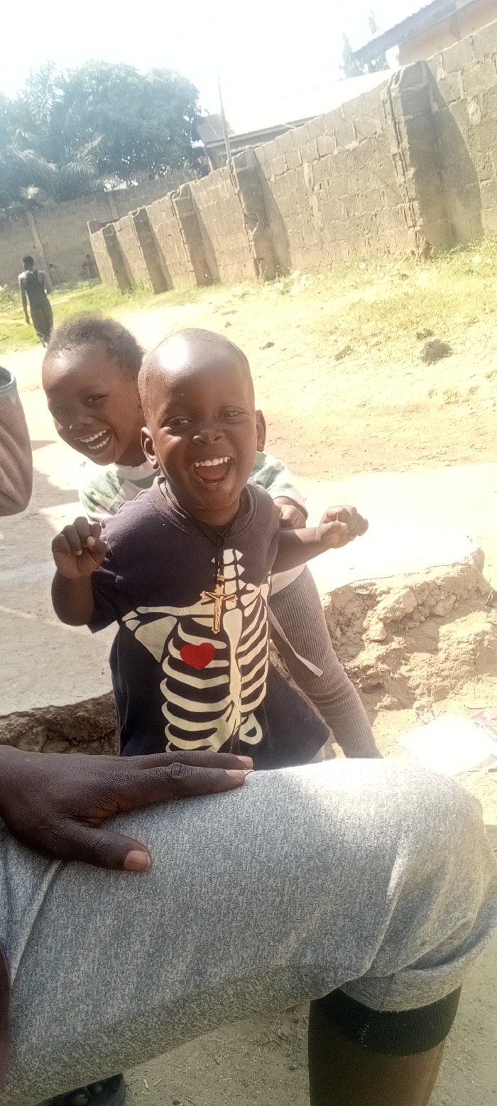 The image depicts an outdoor scene in Ungwan Liman, Nigeria, featuring two young children in the foreground, with an adult partially visible, against a backdrop of a wall and arid environment. **People:** * **Child 1 (foreground):** A young child with dark skin and a shaved head, positioned centrally, looking directly at the viewer with a wide, joyful smile, teeth visible. The child wears a navy blue short-sleeved t-shirt with a white skeleton graphic featuring a red heart on the chest. A gold-colored crucifix pendant on a dark cord necklace is worn around the neck. Both hands are raised slightly and appear clenched. * **Child 2 (mid-foreground):** Partially obscured behind and to the left of Child 1, another young child with dark skin and dark hair, also smiling widely with teeth visible. This child wears a light-colored, possibly striped, long-sleeved shirt. * **Adult (lower foreground):** The lower left portion of the image shows the dark-skinned left hand of an adult resting on a leg clad in grey marl-patterned fabric, possibly sweatpants or similar trousers. This suggests the adult is seated or positioned low, with the children in front. * **Figure (far background):** A dark-skinned individual, possibly an adult, in dark clothing (appears to be a sleeveless top and trousers), is seen walking from left to right in the far left background, partially obscured by the environment. **Objects and Environment:** * **Ground:** The immediate ground surface is dry, light-colored soil or dirt, with sparse patches of light green vegetation visible in the mid-ground. * **Structures:** In the mid-ground, a weathered concrete block wall, constructed with vertical reinforcing elements or pilasters, stretches horizontally across the frame. Beyond this wall, parts of other buildings or structures are dimly visible. * **Vegetation:** Trees and other foliage are present in the distant background, appearing green but somewhat desaturated due to bright lighting. * **Lighting:** The scene is brightly illuminated by natural sunlight, indicating an outdoor setting during daytime. The quality of light suggests a sunny day. **Actions and Interactions:** * The two children are actively smiling, indicating a moment of happiness or play. Child 1 appears to be posing for the camera. * The proximity of the children to the visible adult leg suggests an interaction or supervision by the adult. The overall impression is a snapshot of daily life, capturing a moment of joy among children in a semi-rural or peri-urban setting.