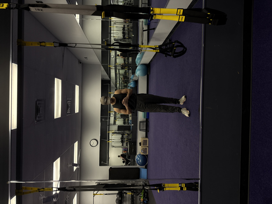 A man wearing a camo hat, tank top, and dark pants stands in a gym, looking at his phone, which is reflected in a mirror behind him. In the background, gym equipment, including TRX straps and exercise balls, are visible. The floor is purple. There is a wall clock on the wall behind the man. Overhead lighting is visible.