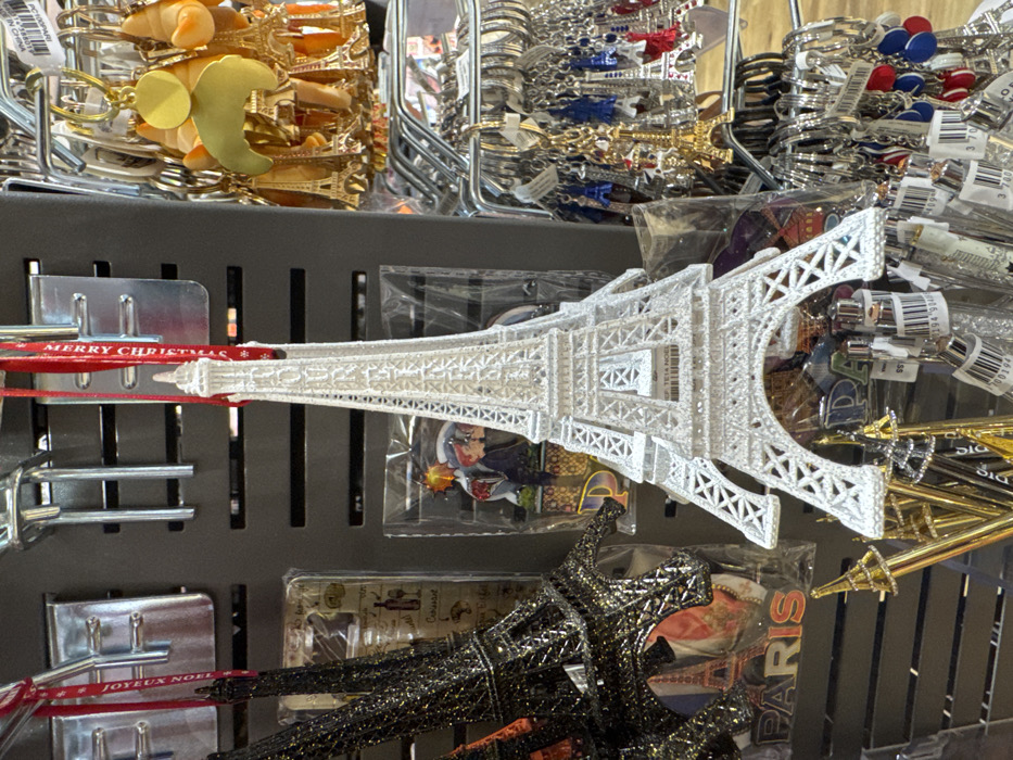 A display shelf holds Eiffel Tower souvenirs