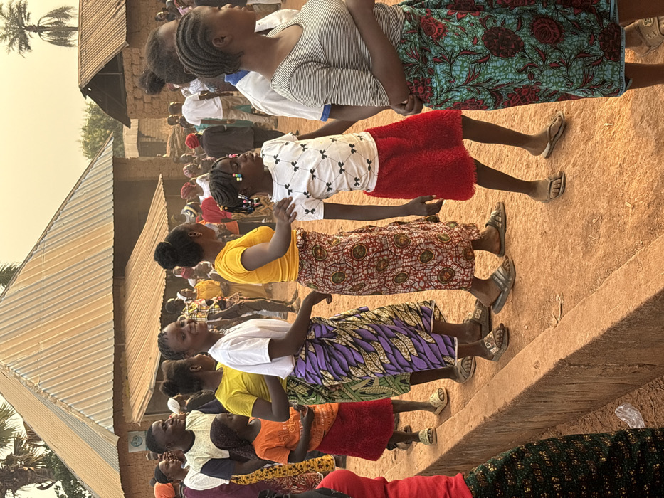 A group of people, predominantly women and children, stand in a line outdoors. They are dressed in vibrant, patterned clothing, including skirts and t-shirts in various colors. Most are looking upwards, possibly observing something. The setting appears to be a village with simple buildings visible in the background. The ground is a reddish-brown color, and a palm tree is visible in the distance. The lighting suggests it is either early morning or late afternoon.
