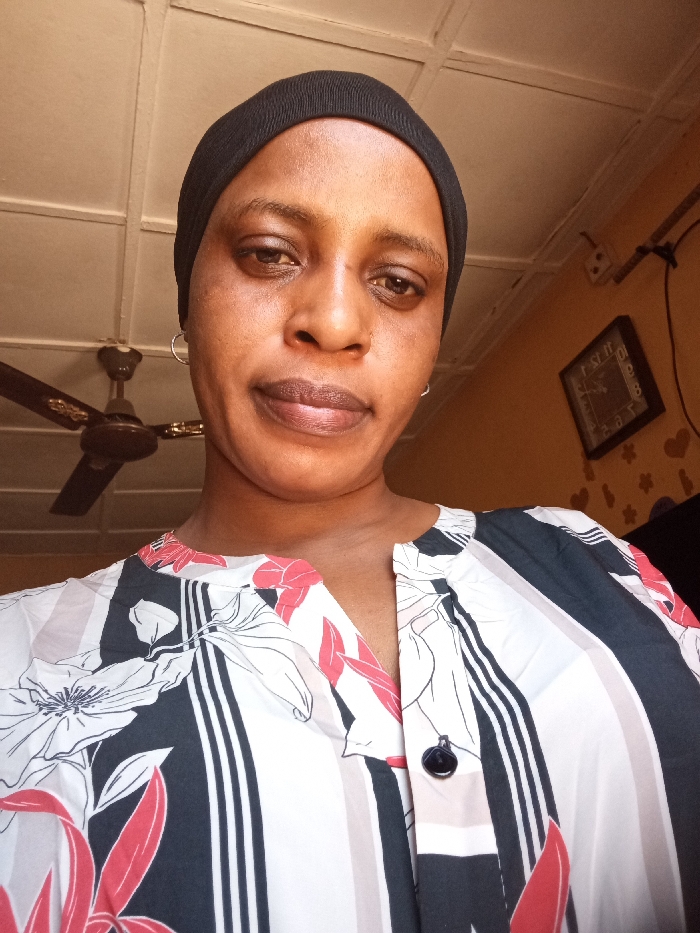 A frontal, waist-up image depicts an adult female indoors, facing the camera with a neutral expression. She wears a black head covering and a patterned garment featuring white, black, and red floral designs interspersed with vertical stripes. Small silver-colored hoop earrings are visible on both ears. The background features a light-colored paneled ceiling and a light brown wall. A brown three-bladed ceiling fan is partially visible in the upper left. A square, dark-framed wall clock with white numerals is mounted on the upper right wall, above subtle decorative elements. Electrical outlets are also visible near the ceiling on the right. The precise location within Narayi, Nigeria, is not visually discernible.