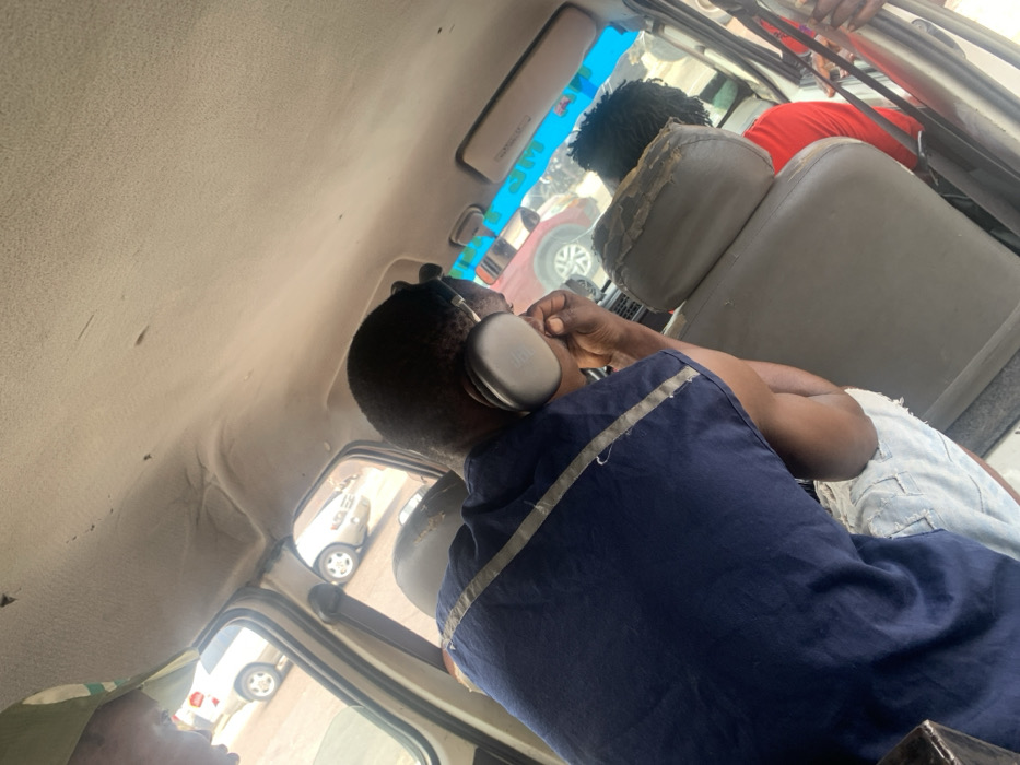 The image displays the interior of a worn vehicle, likely a commercial passenger van or bus, located in Jakande, Nigeria. The perspective is from the rear, looking towards the front. In the mid-ground, a person with short dark hair is seated, wearing a dark blue sleeveless top with light-colored stripes across the shoulders and light-wash ripped denim shorts. This individual is wearing large, silver-grey over-ear headphones and has their right hand raised towards their ear or mouth. Ahead of this person, the back of another passenger's seat is visible; its light-colored headrest is severely damaged with significant tearing and exposed foam. The passenger in this seat has dark, curly hair and is wearing a red shirt. A partial view of a third individual, wearing a green and beige cap, is visible in the upper left corner, possibly in the driver's or front passenger seat. The vehicle's interior ceiling, or headliner, is light-colored, appears aged, and shows signs of sagging and minor imperfections. A blue-tinted visor or panel is visible above the front passenger side. Through the vehicle's windows, other vehicles are visible on a street or in a parking area, including a light-colored sedan to the left and a red vehicle in the distance through the front windshield.