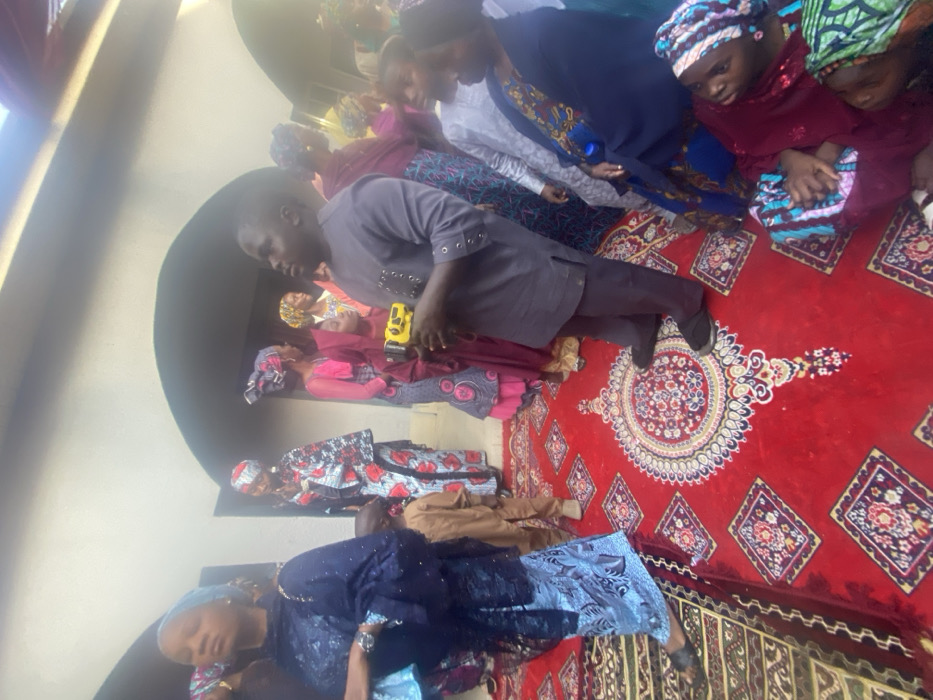 The scene depicts an indoor or semi-enclosed gathering in Kwarbai A, Nigeria, featuring approximately 15-20 individuals, predominantly adults and children