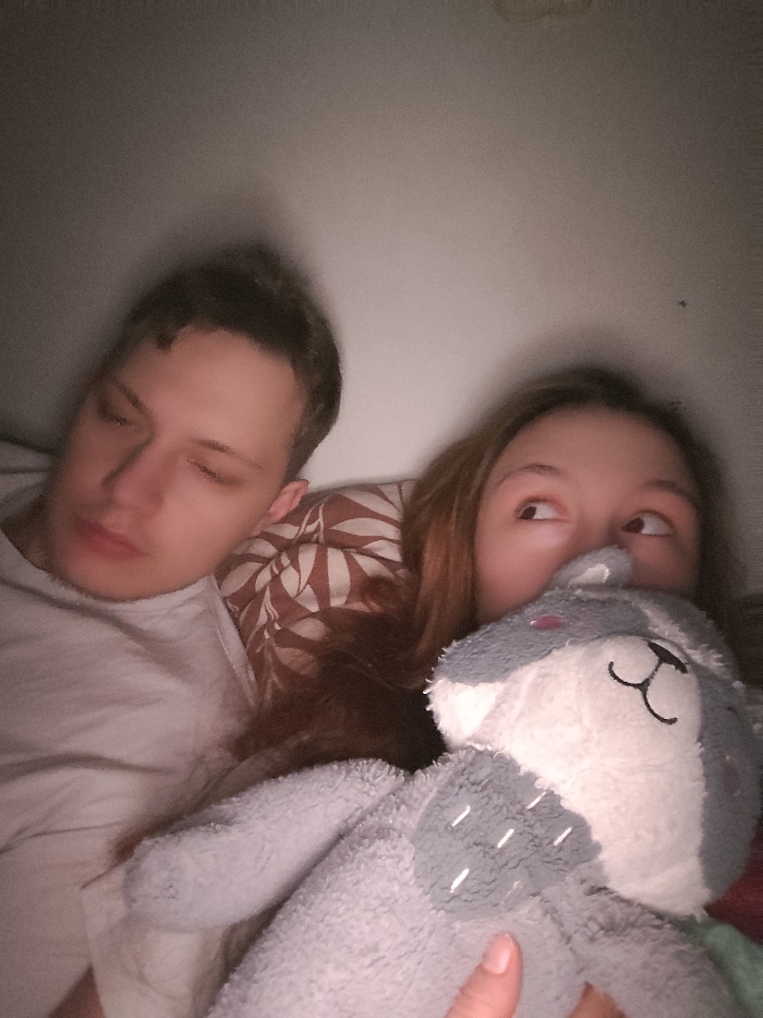The image displays two individuals in a dimly lit, indoor domestic setting, likely a bedroom, located in Vratsa, Bulgaria. On the left, a light-skinned male with short brown hair is visible from the chest up, wearing a light-colored t-shirt. His eyes are closed or nearly closed, and his mouth is slightly open, suggesting a state of rest or sleep. He is partially supported by a light-colored pillow. To his right, a light-skinned female with long reddish-brown hair is present. Her eyes are open and directed upwards and to the viewer's right. She holds a light grey and white plush toy, possibly a cat or fox, with black embroidered eyes, nose, and mouth, featuring white stitching on its chest. The plush toy obscures the lower half of her face. A pillow with a brown and white abstract leaf pattern is visible behind her head. Both individuals appear to be lying down. The background consists of a plain, light-colored wall or ceiling.