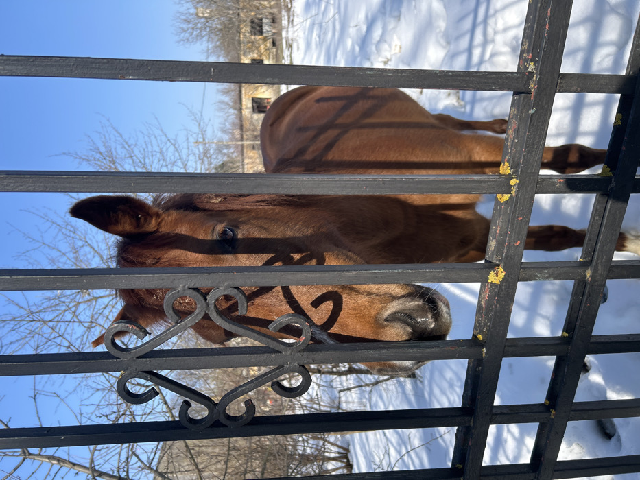 - "The image depicts a brown horse standing in a snow-covered field in Balotești, Romania, viewed through a black metal fence" by FM-nazRh2, licensed under CC BY 4.0