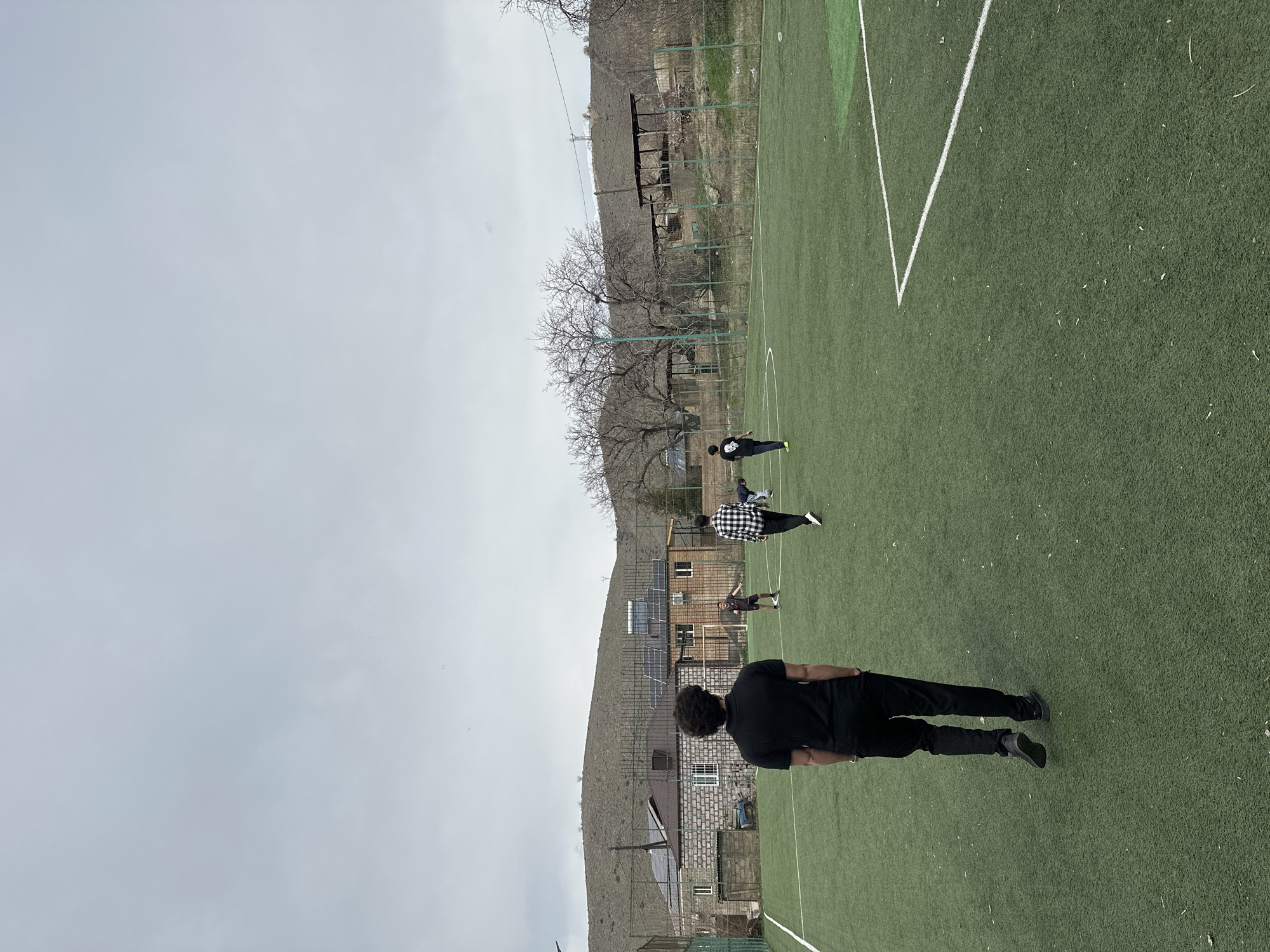The image depicts an outdoor artificial turf sports field, likely a soccer pitch, located in Areni, Armenia. The field is green with visible white line markings, including a corner arc on the right. An overcast, light grey sky dominates the upper portion of the frame. In the foreground, with his back to the camera, is a male individual with dark, curly hair, wearing a black short-sleeved polo shirt, black pants, and dark shoes, walking towards the center of the field. Further into the midground and background, three other individuals are present on the field. One is wearing a black and white plaid shirt with dark pants, walking away from the camera. Another wears a dark short-sleeved shirt and dark shorts, positioned to the right of the first individual. A third person, further back, wears a dark shirt with a light-colored graphic on the back and light-colored footwear. No active play is observed; individuals appear to be walking casually. The background features a perimeter fence along the edge of the field. Beyond the fence, residential structures are visible, including a building constructed with light-colored brick or stone and a building with wooden siding. Both structures feature multiple solar panels installed on their dark-colored roofs. The landscape behind these buildings consists of undulating hills covered in sparse, light-brown vegetation, characteristic of a dry or early spring environment. Several bare deciduous trees are also present. Some open-sided wooden structures, possibly covered seating areas, are visible further to the right in the background, against a higher hillside.