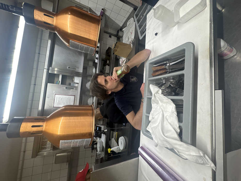 A person drinks from a bottle in a commercial kitchen. Overhead copper heat lamps illuminate the space. A gray utensil organizer with knives, forks, and a white cloth sits on a stainless steel counter. Silver containers and a roll of cellophane wrap are also visible on the counter. Behind the person, stainless steel cabinets and tile walls complete the kitchen scene.
