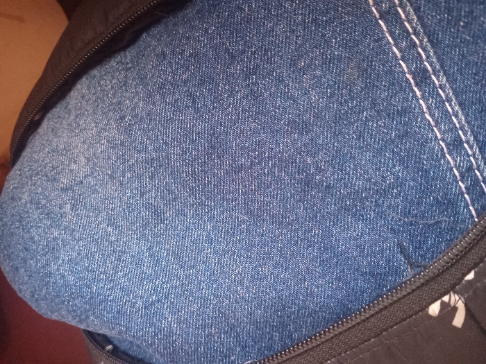 A close-up, downward-angled photograph, taken in Jos, Nigeria, features a segment of blue denim fabric, consistent with the upper thigh or bent knee of a person wearing jeans. The denim displays a standard twill weave with subtle variations in shading, suggesting minor wear. A black zipper, likely part of a bag or an adjacent garment, extends diagonally across the lower left and upper right portions of the frame. Parallel white stitching, indicating a seam, is visible on the lower right area of the denim. The background is largely out of focus, with a dark, indistinct surface observed towards the upper right periphery, suggesting an indoor setting. No individuals or specific actions are clearly depicted.