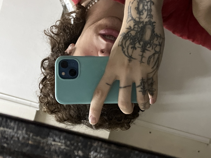 The image displays a close-up, chest-up mirror selfie of an individual in an indoor setting. The individual, presumed to be in Bahía Blanca, Argentina, has medium-toned skin, dark curly hair, and wears a red garment. A white beaded necklace is visible around their neck, and a small stud earring is present in their right earlobe. The individual's left hand, extensively tattooed with dark intricate designs covering the back of the hand and fingers, holds a light-blue or cyan-cased smartphone (featuring a dual-lens camera module) horizontally to obscure the majority of their face. Only the chin, mouth, and lower nose are partially visible, along with parts of the right cheek and ear. The background, reflected in the mirror, consists primarily of white or light-colored walls, with a dark, textured object or surface partially reflected in the upper portion of the frame. No specific identifying landmarks within Bahía Blanca are discernible in the image.