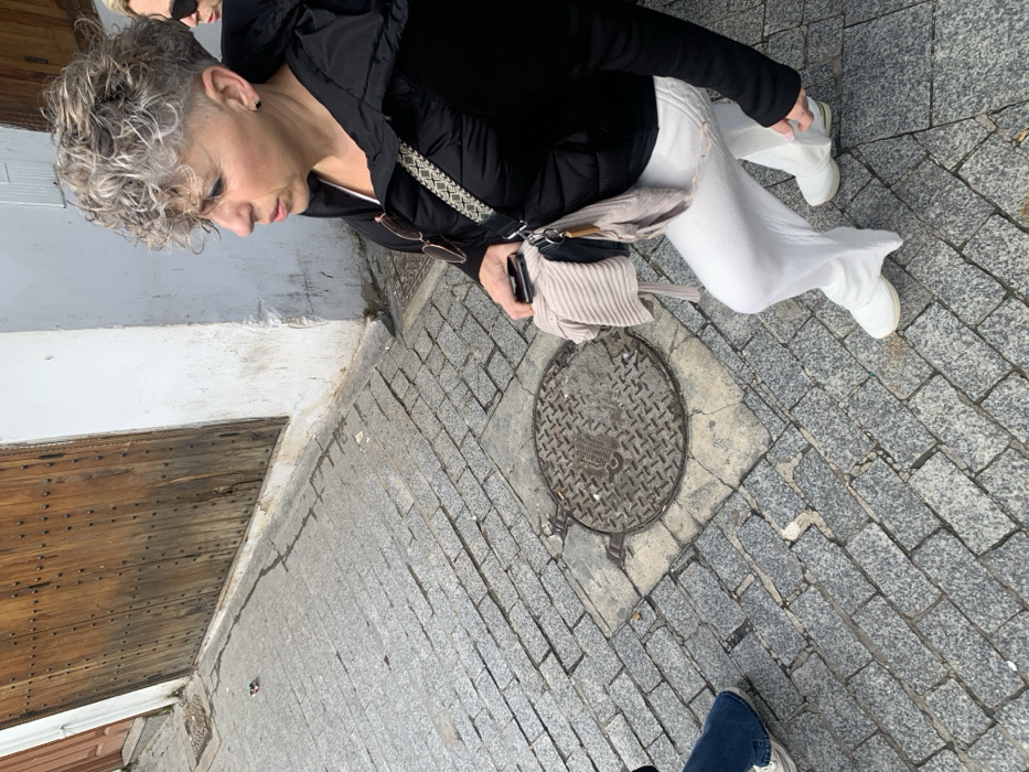 The scene depicts a street in Tangier, Morocco, characterized by grey cobblestone pavement and whitewashed walls. The main subject, a middle-aged female with short, curly, gray-blonde hair and shaved sides, walks forward with her head turned slightly right. She wears a black puffer jacket over a white top, white wide-leg trousers, and white sneakers. Sunglasses hang from her jacket collar. She carries a beige crossbody bag with an embroidered strap, over which a beige ribbed knit garment is draped, and holds a black smartphone in her right hand. To her immediate left, another individual's foot, clad in blue jeans and a white sneaker, is partially visible. Behind the main subject's head, the profile and sunglasses of a second person are discernible. The paved ground features a circular metal manhole cover with a textured surface and "AMANDIS" embossed, positioned centrally in the mid-ground. The right side of the frame shows a worn, white-painted wall. To the left, a tall, weathered wooden double door with numerous metal studs is set into an adjacent wall. The area is illuminated by bright daylight.