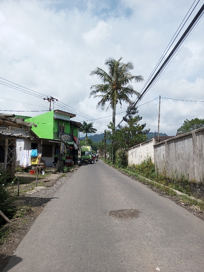 The image depicts a paved, single-lane road extending into the distance under a partly cloudy sky. The scene is located in Ariyalai, Sri Lanka. On the left side of the road, in the foreground, stands a single-story structure with white walls and a rustic, possibly corrugated metal, lean-to extension. White and light blue clothing items are hanging to dry on a line or rack outside this building. Adjacent to it is a two-story building; its upper level is painted a vibrant green, featuring a small balcony, while the ground floor appears to be a storefront with items displayed and a dark entrance. Multiple black electrical wires are strung overhead, supported by utility poles, one of which is visible near the green building. Further down the road on the left, a light green box truck is visible, followed by a person riding a motorcycle. Various bushes and small trees grow along the left edge of the road, particularly between the buildings. The right side of the road is bordered by a long, weathered concrete wall, likely composed of pre-cast panels. Dense green vegetation, including weeds and bushes, grows along the base of this wall and in the ditch beside the road. A tall palm tree, likely a coconut palm, with visible coconuts, stands prominently on the right side, just behind the wall in the midground. Another wooden utility pole is positioned on the right, also supporting overhead wires. The asphalt road surface shows wear, including a distinct pothole in the mid-foreground. In the distant background, gentle hills or mountains are visible under the expanse of a sky featuring both blue patches and scattered white clouds. No direct interactions between people are discernible.