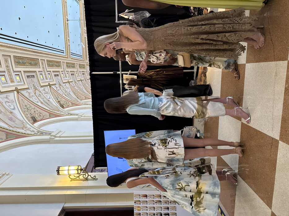 The image features five women at a fashion event, arranged in a row and seen from behind. The first is a blonde woman in a lace gown, and the others are wearing shorter, patterned dresses, with a television behind them. They are accessorized with purses and high-heeled sandals. The setting includes a checkered floor and ornate architectural details on the ceiling. Black curtains create a backdrop for the models.