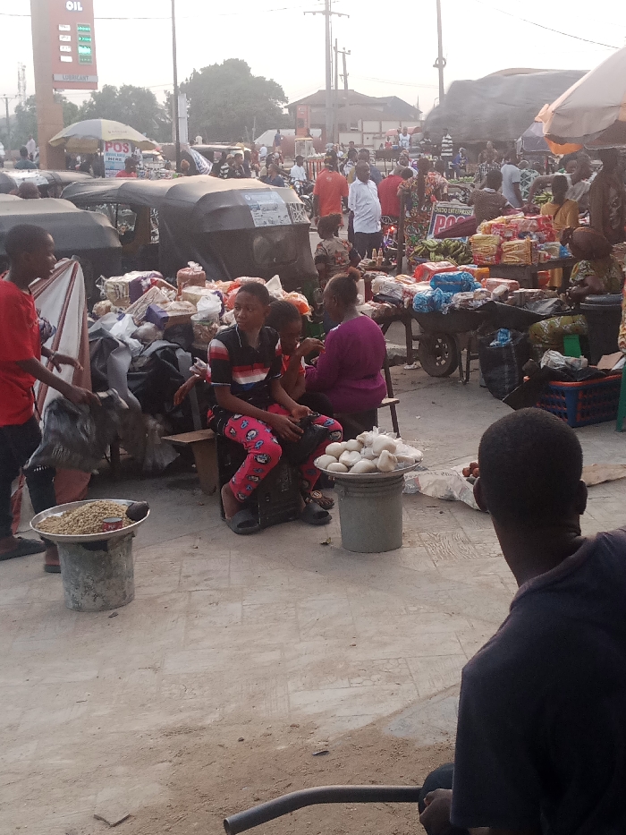A bustling open-air market scene unfolds. Several people mill about, some selling goods from tables and makeshift stands. One vendor sits on a stool behind piles of snacks, while another sits with two children between two small buckets with foods in. Tricycle taxis, laden with goods, are parked nearby, and a gas station looms in the background.