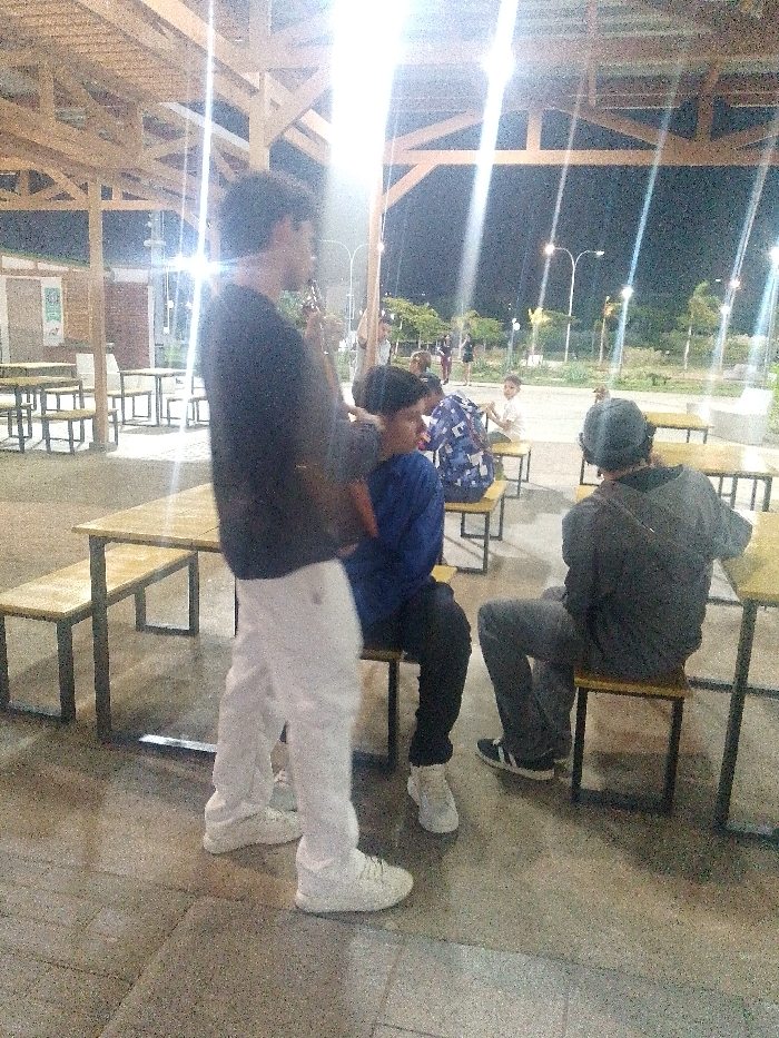 - "At night, several people gather outdoors at picnic tables under a partially roofed structure" by FM-9f1pz2, licensed under CC BY 4.0