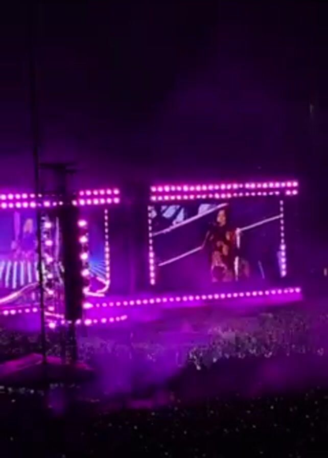 music concert at night. There is a large crowd, and a stage with two large screens. The screens show an artist in a patterned outfit singing and playing guitar. The screens are flanked by vertical light structures with pink lights. There is also pink light shining on the crowd.