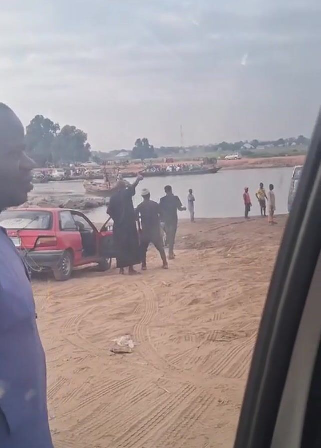 sandy area beside a river. There are several people, a red car, and boats on the river. The people are mostly gathered near the riverbank. Some people dressed in dark clothing are near the red car. They seem to be assisting someone in dark robes to walk. The red car has its driver-side door open. There are tire tracks in the sand, and the sky is overcast. The video is taken from inside another vehicle.
