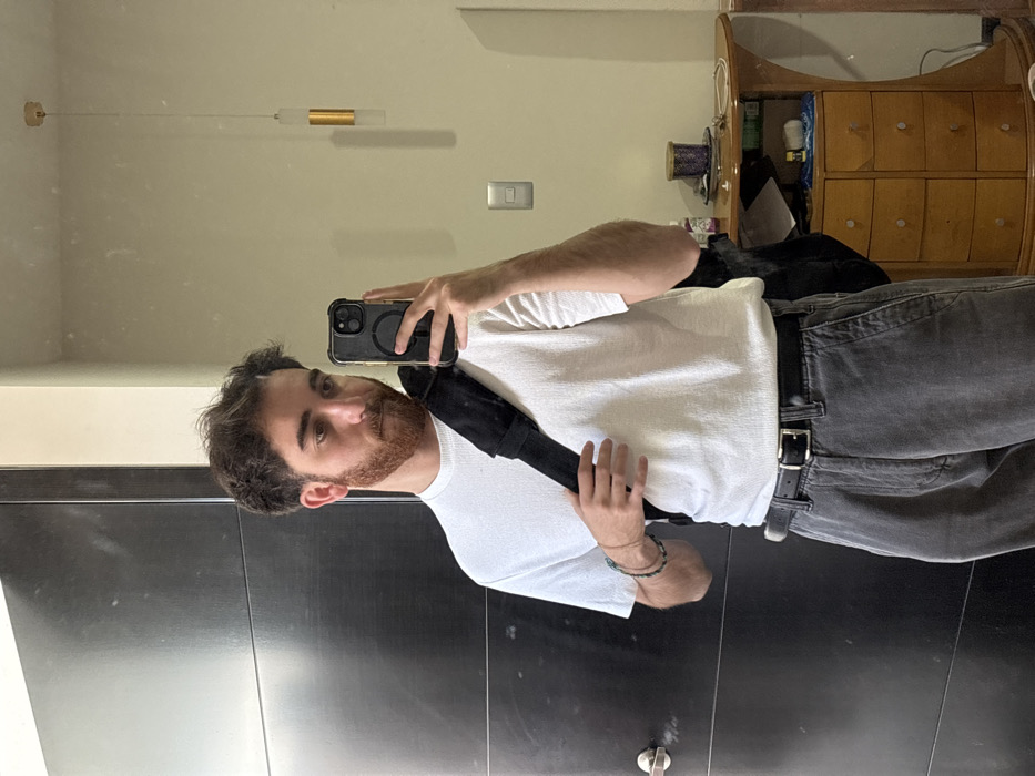 An image taken in Santa Clara Ocoyucan, Mexico, depicts a male individual taking a mirror selfie indoors. The subject, a man in his mid-20s to early 30s with brown, curly hair and a reddish-brown beard, is centered in the frame. He is wearing a white, short-sleeved t-shirt, dark grey pants secured with a black belt and silver buckle, and a black shoulder bag strap across his left shoulder. Multiple beaded and chain bracelets are visible on his left wrist. He holds a dark-colored smartphone, featuring a rear magnetic ring accessory, in his right hand, angled towards the mirror to capture his reflection. His gaze is directed towards the camera within the phone. The background, reflected in the mirror, shows an interior space. To the left of the subject, a dark-colored, possibly black, door with a silver-toned handle is visible. The wall behind and to the right of the subject is a light, neutral color. On this wall, a light-colored electrical switch is present. Above the switch, a modern pendant light fixture hangs from the ceiling, composed of a gold-colored cylindrical segment above a clear or frosted cylindrical segment. Below the switch, a wooden console table or dresser with a curved front is positioned. It has a light-colored wood top and multiple drawers on its right side. On the table's surface, a dark-colored candle in a container, a small white dish, a small bottle with purple contents, and other indistinct small objects are arranged. Papers or items are also visible in an open section of the table.