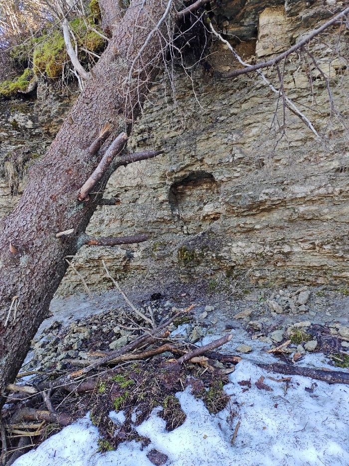The scene depicts an outdoor natural environment in Lopukhinka, Russia. A stratified rock cliff face, primarily light brown and grey in color with distinct horizontal layers, dominates the background. Approximately midway up the cliff and slightly right of center, an ovular recess or small cave opening is present. A large conifer tree, exhibiting dark brown, textured bark, lies diagonally across the left side of the frame, leaning against the lower portion of the cliff face. Several broken branches extend perpendicularly from the tree's main trunk. The ground at the base of the cliff and in the foreground consists of loose soil, assorted rock fragments, scattered fallen branches and twigs, and patches of green moss. Irregular patches of white snow are visible on the ground, particularly in the immediate foreground. No human or animal subjects are present, and no actions or interactions are depicted.