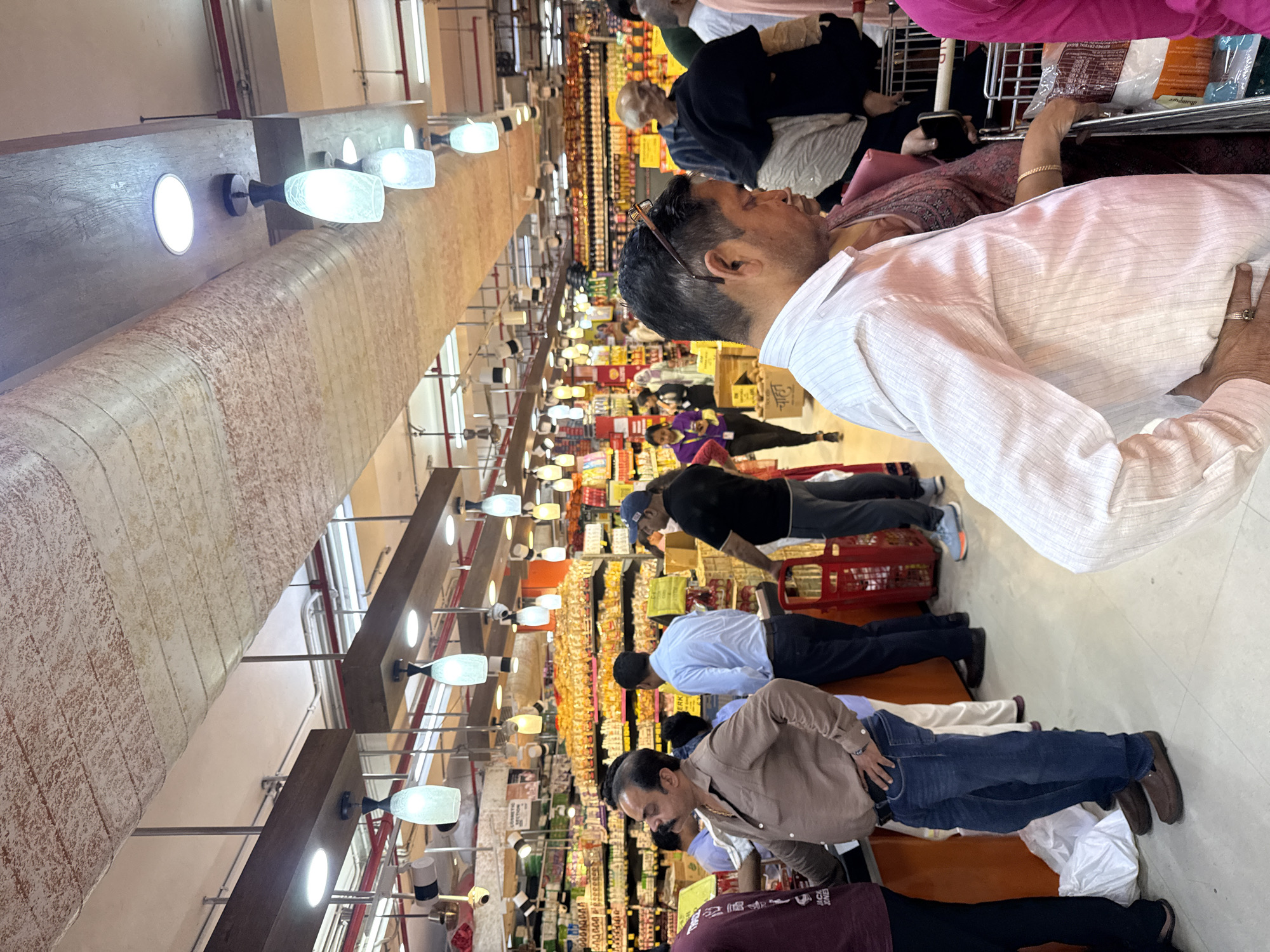 The image depicts a crowded indoor supermarket, specifically located in Delhi, India, evidenced by visible Hindi signage. The perspective is from within a queue, facing into the store. The environment features high ceilings with a suspended, textured, light-colored fabric panel running horizontally. Below this, multiple light fixtures are visible, including recessed downlights and various pendant lights with frosted white or light blue glass shades. Exposed red piping runs along the upper ceiling. Numerous aisles stretch into the background, lined with floor-to-ceiling shelves packed with packaged goods, including food items and a designated "Cosmetic Section" visible on a sign. The floor is light-colored and appears to be tiled. Approximately 15-20 individuals, predominantly adults of South Asian ethnicity, are visible. In the immediate foreground, a man in a white striped shirt and dark trousers stands with his right hand on his hip, next to a metal shopping cart containing items in white plastic bags. Next to him, a woman in a dark pink patterned garment is partially visible, her hand near the shopping cart. Further back, a man in a brown shirt and blue jeans stands with his hands on his hips, near a counter where white plastic bags are on the floor. A man in a light blue collared shirt is seen facing away, near a red plastic shopping trolley. Other individuals are scattered throughout the store, some pushing shopping trolleys, others standing in queues. A woman in a purple top walks through an aisle in the mid-ground. The overall activity suggests shopping and waiting to check out.