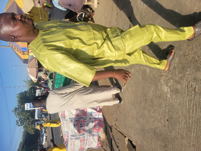 This image displays an outdoor urban scene during daylight in the city of Bauchi, Nigeria, appearing to be a market or commercial area. The sky is clear and light blue. In the immediate foreground, a dark-skinned adult male is in motion, walking from right to left, facing away from the camera's direct line of sight. He is bald and wears a light lime-green traditional Nigerian attire comprising a long-sleeved tunic and trousers, complemented by dark grey slide sandals. His right arm is partially visible, while his left hand grips a dark, indeterminate object. The ground beneath him is a concrete surface, exhibiting cracks and textured horizontal grooves. In the midground, another adult male, viewed from behind, walks away from the camera. He wears a long, light beige robe and dark shoes. To the left of this individual is a large, white, irregularly shaped object, possibly a stack of goods, covered with material displaying red and black text, partially legible as "3X LONGOTE CEMENT." A green tarp or cover is situated behind this object. Further in the midground and background, a busy street environment is visible. Several people are present, including two individuals distinctly dressed in yellow uniforms or outfits. Multiple market stalls are apparent, characterized by colorful striped canopies in shades of yellow, orange, and blue. One stall features a partial sign with the number "21." In the background, a road accommodates vehicular traffic, including a white car, a silver sedan, and a large truck. A prominent blue and red Mobil fuel station sign, bearing the "Mobil" logo, is visible above the road. Distant streetlights and scattered trees line the horizon.