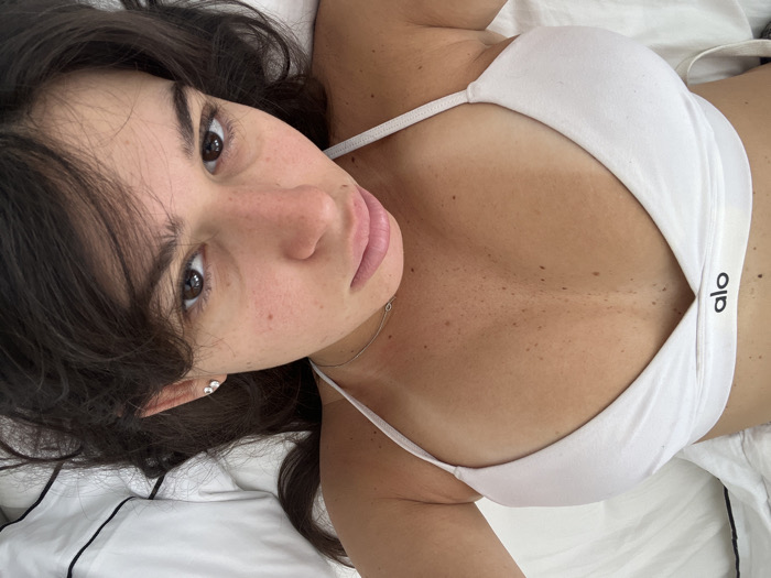 A female individual is depicted in a close-up, top-down perspective, lying on white bedding. She wears a white sports bra, featuring the vertically oriented 'alo' brand logo on the left breast area. The skin on her chest and upper torso displays numerous small macules and areas of differential pigmentation, consistent with freckles and tan lines. Dark, wavy hair frames her head against the white fabric. A single silver-colored stud earring is present in her right earlobe. Her gaze is directed towards the camera, maintaining a neutral expression. The immediate environment consists solely of white textiles, identified as bedding, with a minimal black piping detail visible along a seam in the upper left background. The image provides no discernable features to identify a specific location in Milan, Italy.