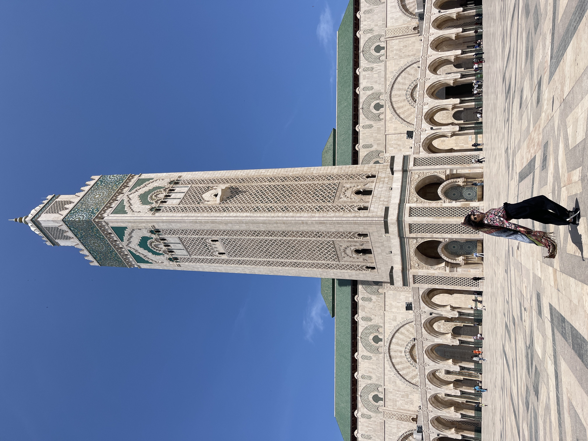A medium-shot photo features the Hassan II Mosque in Casablanca, Morocco, against a clear blue sky, taken from a low-angle perspective