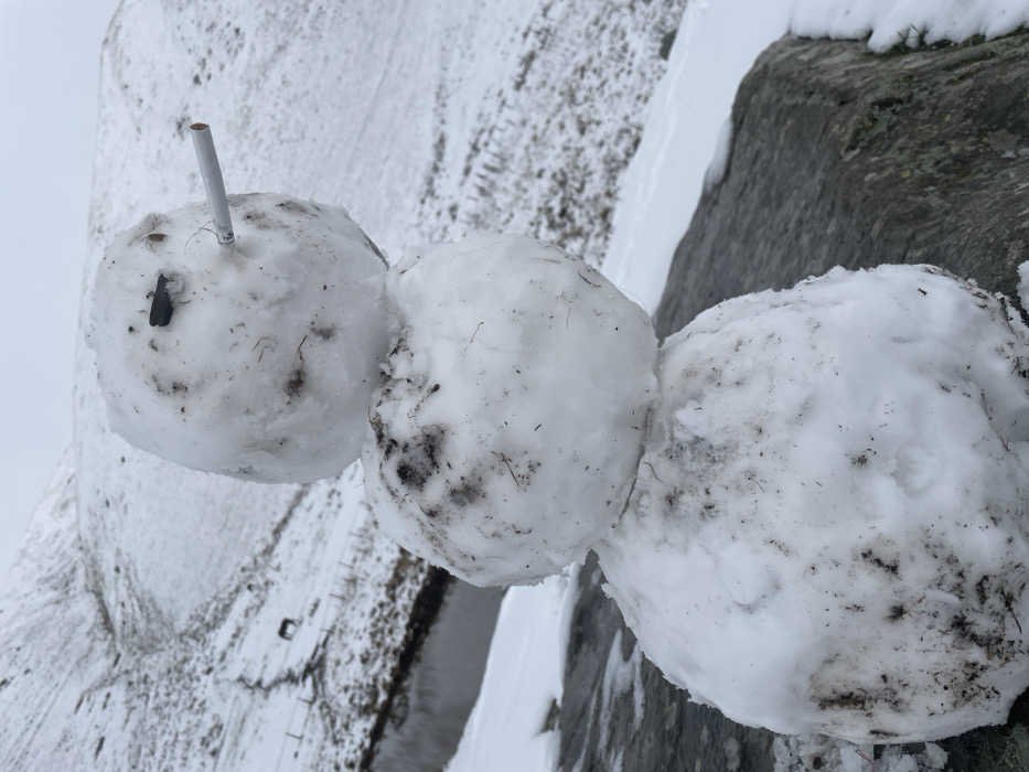 A three-tiered snowman, constructed from snow containing visible soil and plant debris, occupies the foreground, positioned on a large, grey rock formation partially covered in snow
