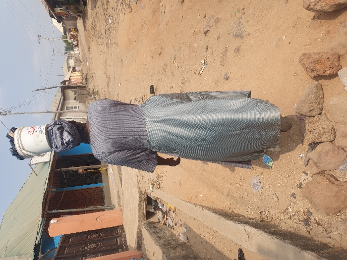 An individual is depicted from the rear, walking away from the viewer on an unpaved dirt road. The person wears a grey headwrap supporting a white plastic bucket containing dark, undefined material on their head. They are dressed in a long-sleeved, vertically striped top and a long, horizontally patterned skirt or dress. The foreground of the road is strewn with several irregular rocks. To the immediate left, a concrete curb borders a gutter containing various debris. Beyond the gutter, a single-story structure with a blue facade, two orange-brown pillars, and dark security gates is visible; its roof is light green corrugated metal. The unpaved road extends into the background, flanked by additional single-story buildings of varying construction styles and corrugated roofs. Utility poles with multiple power lines are visible overhead against a clear, light blue sky. A small, yellow vehicle is partially visible in the distant background. This scene is located in the city of Burwood, Australia.