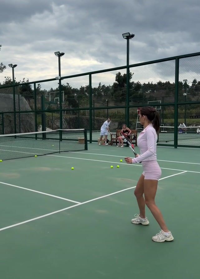 tennis court with two people playing tennis and two people sitting on a bench in the background. The tennis court is green with white lines and has a net in the middle. There are several tennis balls scattered around the court. The person in the foreground is a woman wearing a pink athletic outfit and white sneakers, and she is holding a tennis racket. She has just hit the tennis ball and is now watching it. The other person playing tennis is a man wearing a white shirt and white shorts. He is standing on the other side of the net and is about to hit the ball. The two people sitting on the bench are both women, and they are watching the tennis match. The sky is cloudy, and there are trees and a fence surrounding the tennis court. The camera is positioned behind the woman in pink and follows her as she moves around the court.