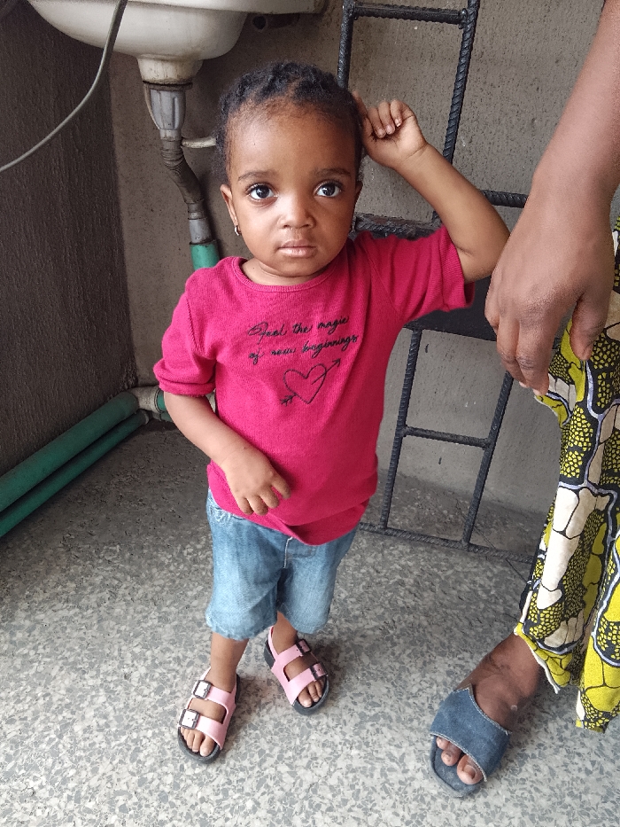 young child, approximately two to three years old, standing on a light grey speckled concrete floor. The child has dark skin, braided dark hair, and wears a deep pink short-sleeved t-shirt with black text and a heart-and-arrow graphic, blue denim shorts, and light pink two-strap sandals. A small gold hoop earring is visible in the child's left ear. The child's left arm is bent, with the hand near their temple, while their right arm is down. To the right, an adult's right arm, hand, and lower leg are partially visible, dressed in a vibrant yellow, white, and black patterned fabric and a single denim-blue slide sandal. The background on the left side features a white ceramic sink with exposed grey plumbing and two horizontal green pipes against a light grey concrete wall. On the right, dark metal bars, possibly part of a gate or railing, are visible against a similar concrete wall. The scene is illuminated by ambient light. The specific location within Lagos, Nigeria, is not discernible from the visual information, but the setting is consistent with a residential or utility area in an urban environment.