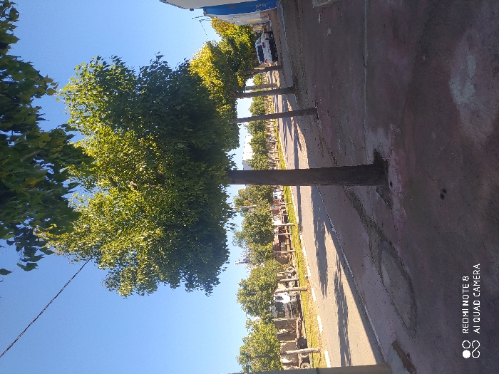 This image displays a street scene in Majjate, Morocco, under a clear blue sky during daylight hours. In the immediate foreground, an uneven reddish-brown ground surface, possibly a sidewalk, shows cracks and lighter discolorations. A tree with a thick brown trunk and dense green foliage stands right of center in the foreground. A grey-paved road extends from the mid-ground into the distance, flanked on both sides by rows of trees with green leaves. On the left side of the road, further back, several light-colored heavy-duty trucks are parked. On the right side of the road, a white sedan is parked parallel to the curb next to a building, the visible portion of which features a white upper section and a blue lower section. Strong shadows from trees and vehicles are cast onto the road and ground, indicating direct sunlight. A black utility line is visible against the sky in the upper left quadrant. No individuals are present in the scene. A "REDMI NOTE 8 AI QUAD CAMERA" watermark is visible in the lower-left corner.