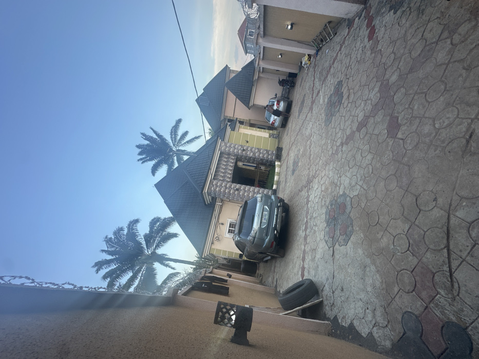 The image depicts a residential compound in Nnewi, Nigeria, under a clear, light blue sky