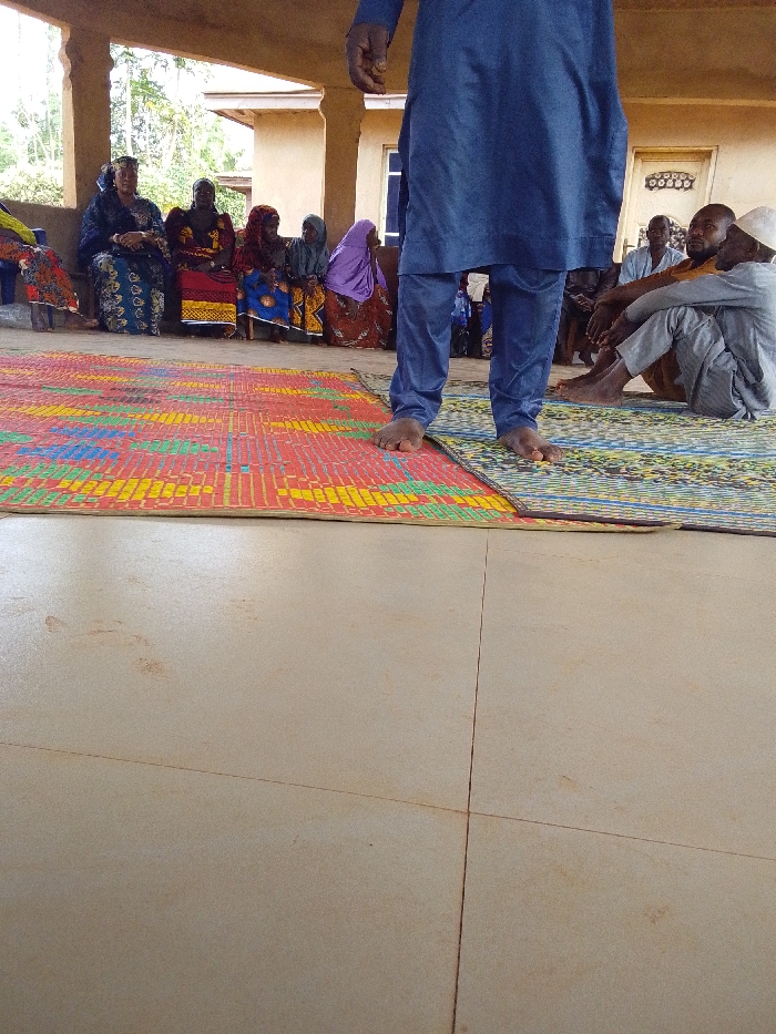 The scene depicts an gathering inside a covered, semi-open structure in Emabo, Nigeria, with a light-colored tiled floor. In the immediate foreground, the lower half of a barefoot individual, wearing a blue traditional garment and trousers, stands on a multicolored mat with blue, yellow, and green patterns. Adjacent to this is a larger, rectangular mat primarily red with yellow, green, and blue linear patterns. To the left, a row of six women are seated on chairs behind the red mat. They are dressed in various colorful traditional Nigerian fabrics; one woman on the far right wears a purple head covering. To the right, three men are seated directly on the mats. One man in the foreground wears a light grey garment and a white skullcap, sitting with his legs bent. Another man behind him wears a tan garment. The background shows a building structure with light brown or tan pillars and walls. An open doorway or window is visible on the far right. Beyond the structure, green foliage suggests an outdoor environment. The overall lighting is bright, indicating daytime.