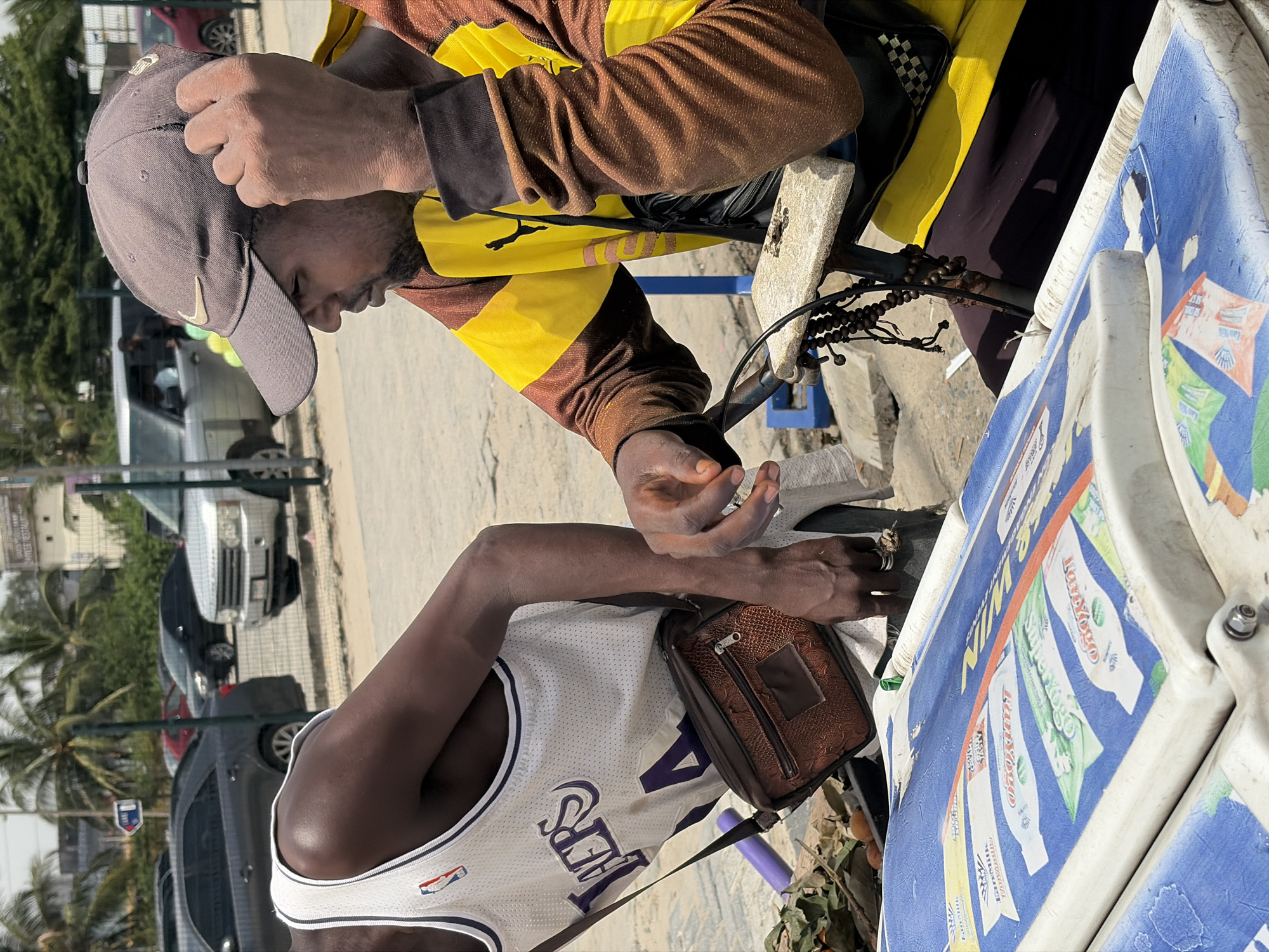 two men standing on a street in Igboefon, Nigeria. One man wears a brown and yellow long-sleeved shirt and a grey baseball cap. He appears to be engaged in a transaction or activity near a bicycle-mounted stall. The second man is wearing a Lakers jersey. The stall displays advertisements for various products. Cars and palm trees are visible in the background, indicating an urban environment. The scene suggests an informal commercial transaction or street vending activity in the described location.