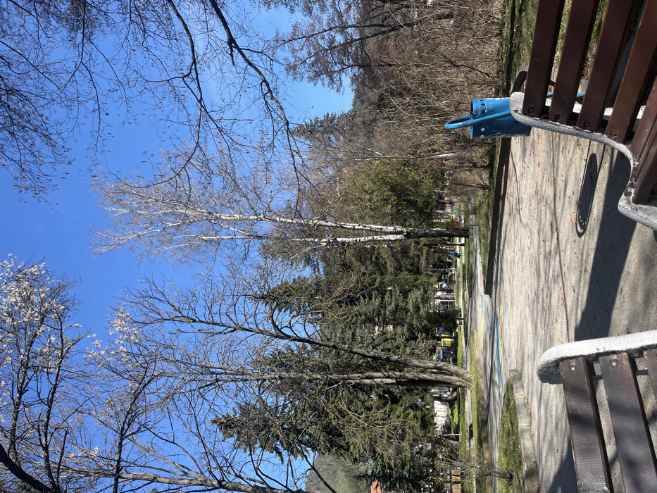 The image depicts a public park or green space in Devin, Bulgaria, on a clear, sunny day. The perspective is low, looking forward from between two park benches. In the immediate foreground, the backs and armrests of two park benches are visible, constructed with dark wooden slats and light-colored concrete or stone supports. The ground directly in front of these benches is paved with asphalt or concrete, showing some scattered debris and pronounced shadows from the benches. The midground features a paved pathway, likely asphalt, that curves from the left towards the right. Sections of this path have faded blue and yellow markings. The path is bordered by patches of green grass and a diverse assortment of trees. Numerous deciduous trees stand with bare branches, some exhibiting early buds or catkins, particularly two prominent white-barked birch trees towards the center-right. Several tall, dark green conifer trees (evergreens) are interspersed among them. To the right of the path, a blue cylindrical metal trash can with a black rim is visible. A vertical yellow mark is present on the trunk of one of the birch trees. Further right, an area of dry, brown undergrowth and sparse shrubs is evident. In the background, beyond the trees, scattered buildings with light facades and roofs can be discerned on the left. Dark green, forested hills or mountains rise in the distance, predominantly on the left side of the frame. The sky above is uniformly clear and bright blue. No individuals or active interactions are visible in the scene.