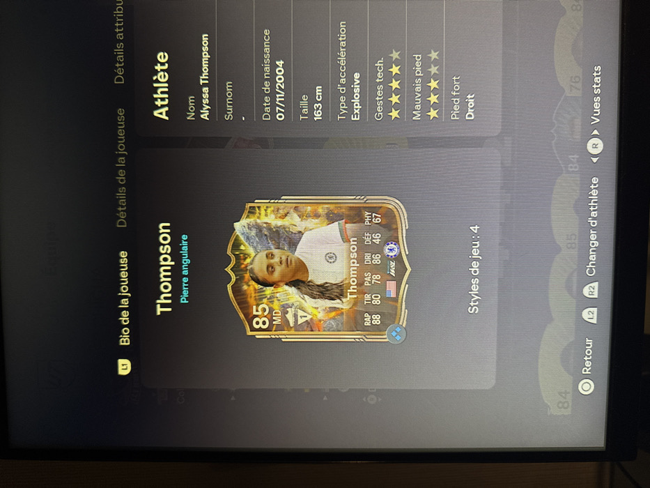 A digital screen displays a video game interface, likely a football simulation, featuring a player profile in French. The primary subject is a golden-bordered player card for "Thompson" with an overall rating of "85 MD" (Milieu Droit/Right Midfielder). The card depicts a female athlete, Alyssa Thompson, from the chest up, with dark braided hair, wearing a white and blue collared shirt. Her in-game statistics are visible on the card: RAP 88, TIR 80, PAS 78, DRI 86, DEF 46, PHY 67. Below these, an American flag, EA Sports logo, and Chelsea FC logo are present. To the right of the card, an "Athlète" (Athlete) information panel details "Nom: Alyssa Thompson," "Date de naissance: 07/11/2004," "Taille: 163 cm," "Type d'accélération: Explosive," "Gestes tech.: ★★★★★" (5 stars), "Mauvais pied: ★★★★★" (5 stars), and "Pied fort: Droit" (Right foot). A menu bar at the top includes "Bio de la joueuse," "Détails de la joueuse," and "Détails attributs." At the bottom, game control prompts are visible: "Retour" (Return) with a circle button, "Changer d'athlète" (Change Athlete) with L2/R2, and "Vues stats" (View Stats) with R. The screen itself shows minor reflections of a dimly lit room. The image contents do not provide any visual information to determine its physical location in the city of Kaysersberg Vignoble, France.