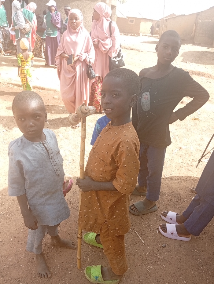 Three young boys stand outdoors. One boy in a grey outfit stands to the left, barefoot. Another boy in an orange outfit holds a bamboo stick topped with round objects. The third boy wears a black shirt and blue pants. Women in hijabs stand in the background, and there are buildings in the distance. The ground is light brown dirt. The boys are all wearing sandals, except for the one on the left.