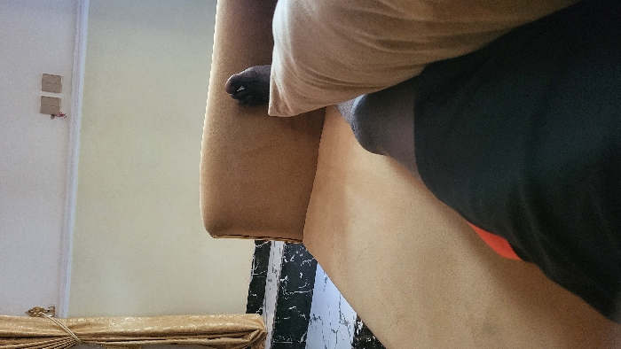 The image depicts an indoor scene in Babawa, Nigeria, from a first-person perspective looking down. A dark-skinned individual is reclining on a beige upholstered chaise lounge, with their right leg, partially clad in black trousers or shorts with a visible red accent, extending forward. Their bare, dark-skinned foot rests on a beige pillow positioned on the chaise. In the background, a light-colored wall is visible, with golden-tan curtains tied back to the left, and black and white veined marble-patterned tiles on the floor or steps beneath. Two square, light-colored electrical outlets or faceplates are mounted high on the wall, with a small red object hanging from one of them. The ceiling is white with a white trim line.