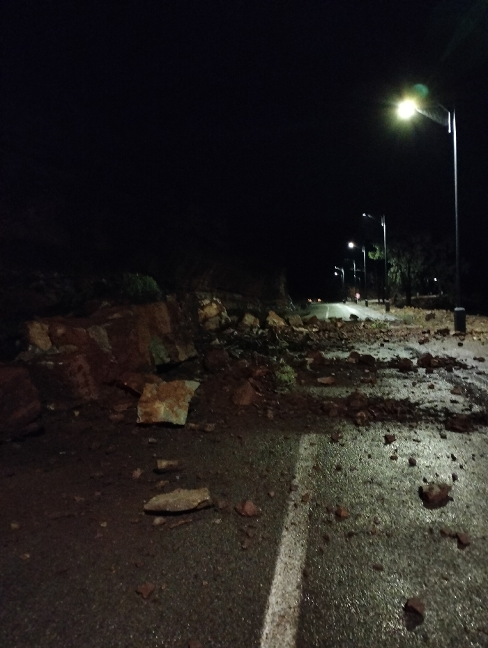 At night, a road is obstructed by a rockslide. Large boulders and smaller debris cover the road surface, illuminated by streetlights. The rockslide appears to originate from an embankment on the left side of the road. A white lane marking is visible on the right side of the road, partially covered by rocks. The dark sky and dimly lit environment suggest a remote location or a situation after sunset.