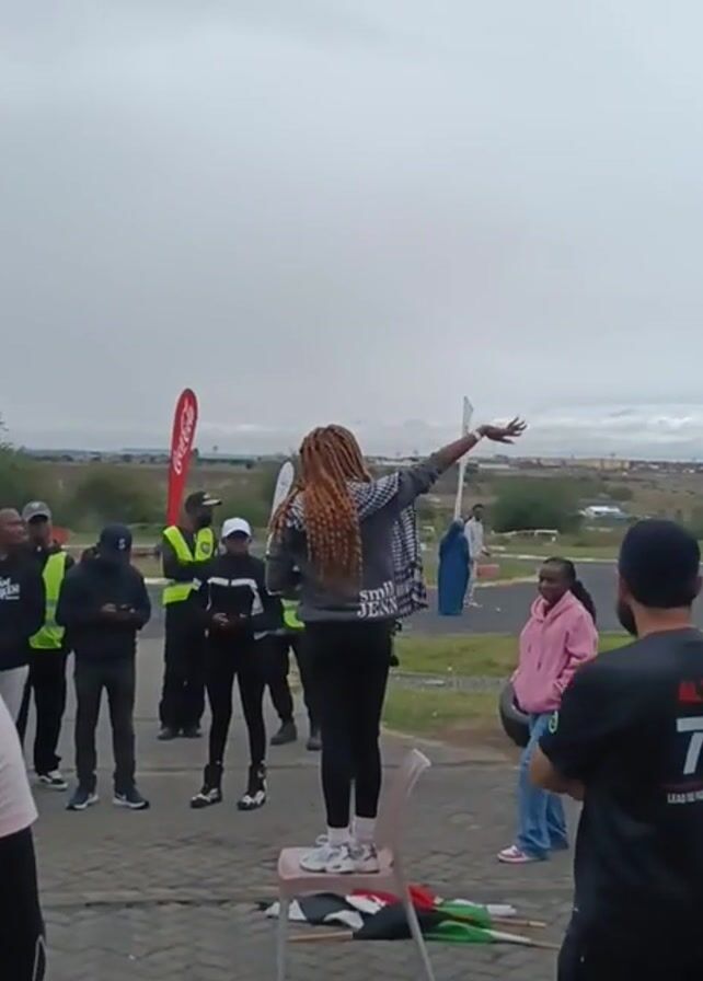 A woman is standing on a chair and addressing a group of people in an outdoor setting. The woman has long braids, is wearing black pants, a gray top with white writing on the back, and white sneakers. She is gesturing with her right arm. The people are standing and listening to her. Most of them are men. Some are wearing vests with the colors yellow and black. There are banners behind the group, and a tire lying on the ground. The environment appears to be a racetrack. The sky is overcast.