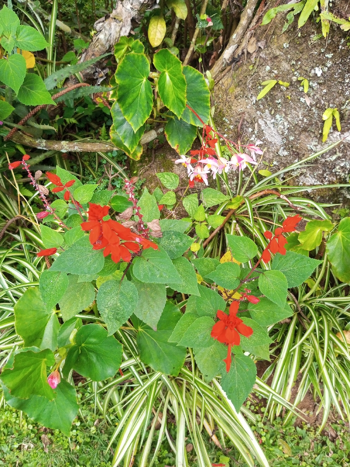 A vibrant cluster of plants thrives near a tree trunk. Red salvia flowers, with their bright color and distinctive shape, stand out amongst the green foliage. Begonia plants with large, heart-shaped leaves are also visible. Intertwined with the flowering plants are striped spider plants, adding a textural contrast with their slender, arching leaves. The surrounding area appears to be a natural setting with various other plants in the background.