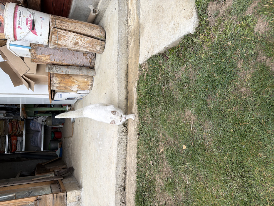 The image depicts an outdoor and semi-enclosed utility area in Samokov, Bulgaria. In the central foreground, a white cat with light brown-grey markings on its face and ears is seen descending a concrete step, walking forward with its tail held vertically erect. The immediate foreground consists of a patch of patchy green grass with areas of exposed soil, bordering the concrete step. Behind the cat, on the elevated concrete surface, various objects are present. To the left, an open doorway leads into an interior storage space. Visible inside are metal shelving units holding multiple white sacks, one displaying Cyrillic text including "20 кг" and "МРѴТОЦЪІІ." Several plastic buckets and a grey gas cylinder are also discernible within this storage area. To the right of the doorway and behind the cat, against a partially visible reddish-brown building structure, a collection of cut logs of varying sizes are stacked, some exhibiting visible insect bore patterns. Adjacent to these logs are several cardboard boxes, one explicitly labeled "OVEN." A white plastic bucket marked "licata + greitou GreuSil 25kg" and another generic white bucket are also situated on the concrete surface.