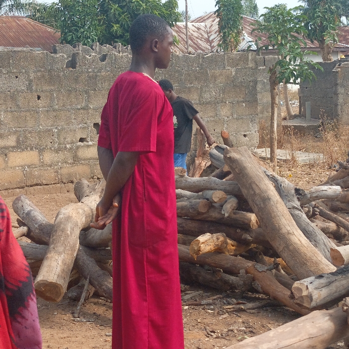 The image captures an outdoor scene in Akwanga, Nigeria. In the foreground, a young Black male stands in profile, facing right, wearing a long, loose-fitting, bright red garment. His hands are clasped behind his back. A portion of another individual, clothed in red and black patterned fabric, is visible on the extreme left. In the mid-ground, a substantial pile of cut wooden logs and branches is present. Another young Black male, seen from the back, wears a black t-shirt and blue lower garment and is positioned near the woodpile, appearing to interact with it. The background consists of a low, weathered concrete block wall, behind which corrugated metal roofs and scattered green trees and foliage are visible under a clear sky. The ground is composed of dry, reddish-brown earth.